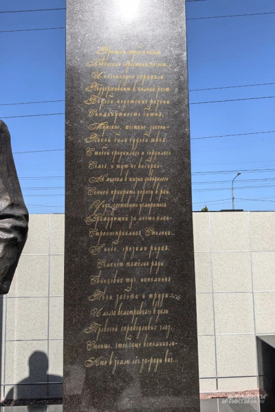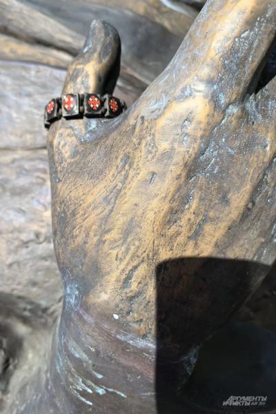 На большой палец правой руки кто-то надел амулет. Слева от памятника возвышается мраморная стела с выбитыми на ней стихами.