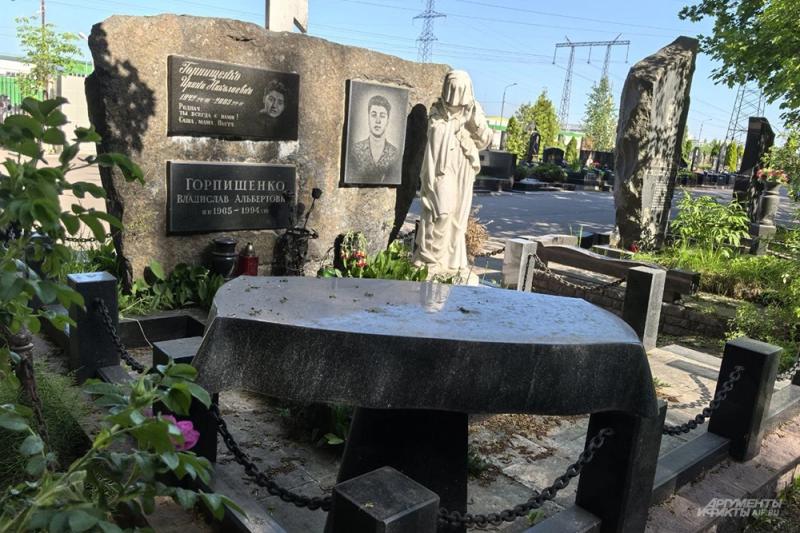 И действительно, рядом с могилой Тараскина располагается захоронение соратника Сильвестра по Ореховской ОПГ Владислава Горпищенко по прозвищу Гарп. Он стоял у истоков банды, но потерял доверие, и в 1994 году его свои же и пристрелили. На надгробной плите портреты покойного и его матери Ирины Николаевны, пережившей сына на 9 лет — они похожи, словно одно лицо. В углу плиты — скульптура скорбящей женщины, по диагонали — мраморный поминальный стол. Две вазы — с железными розами и живыми, увядшими гвоздиками.