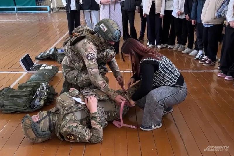 «Миф» (сидит слева) проводит занятие со школьниками по тактической медицине. Фото: АиФ/ Никита Сахаров