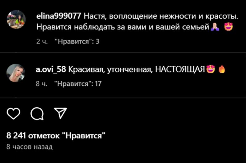 Женой восхищается не только Овечкин, но и ее многочисленные поклонники. «Красивая, утонченная, настоящая», «Настя, воплощение нежности и красоты. Нравится наблюдать за вами и вашей семьей», — восторженно пишут под публикацией подписчики.