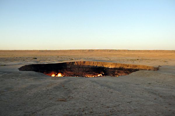 В 1971 году возле деревни Дарваза в Туркменистане советские геологи обнаружили скопление подземного газа. В результате раскопок и бурения разведочной скважины геологи наткнулись на подземную каверну (пустоту), из-за чего земля провалилась и образовалась большая дыра, наполненная газом. © flickr.com / Tormod Sandtorv