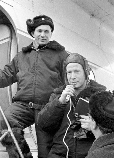 Экипаж космического корабля «Восхода-2» Павел Беляев и Алексей Леонов (справа) дают первое интервью после приземления. © РИА Новости / Александр Моклецов