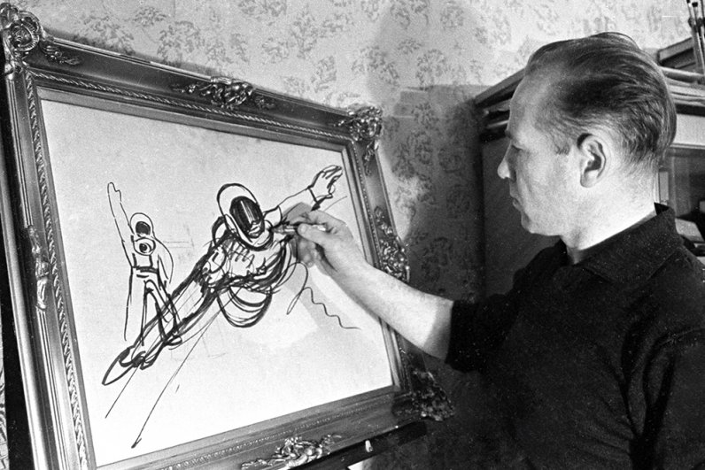 Летчик-космонавт СССР Алексей Леонов за наброском рисунка «Выход в космос». © РИА Новости / Александр Моклецов