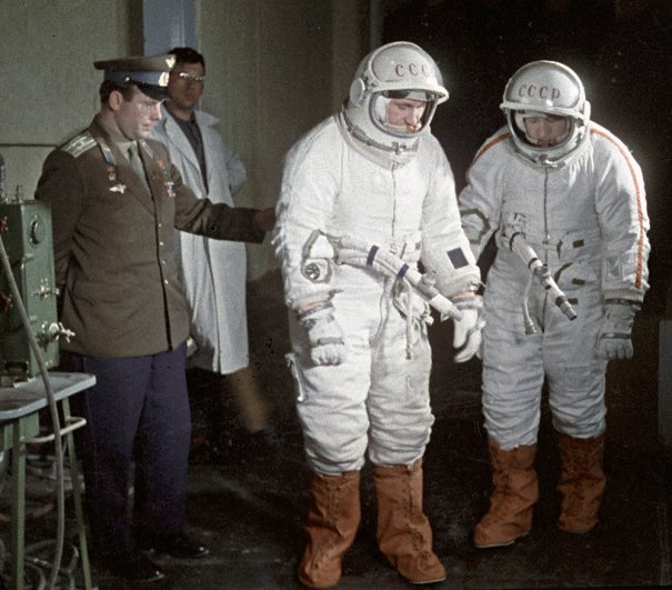 Летчик-космонавт СССР, заместитель начальника Центра подготовки космонавтов СССР Юрий Гагарин (слева) провожает экипаж космического корабля «Восхода-2» командира корабля Павла Беляева (в центре) и пилота Алексея Леонова на стартовую площадку. © РИА Новости / Александр Моклецов