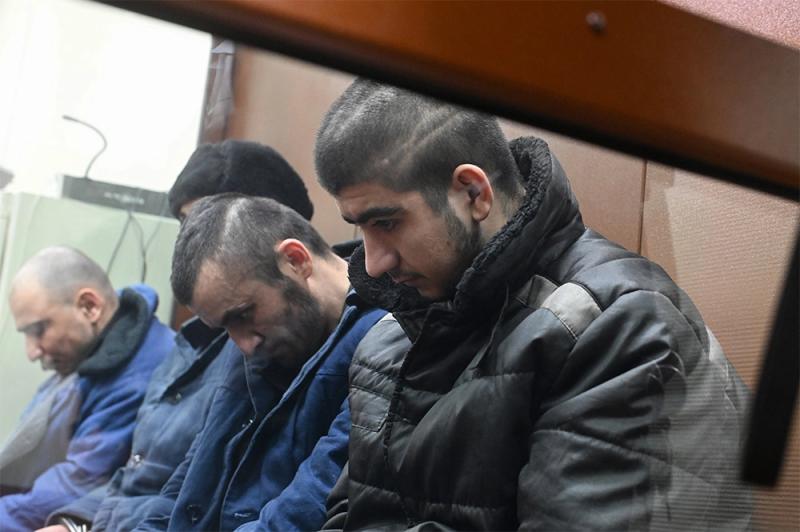 Фигуранты по делу о теракте в «Крокус сити холле» Муродали Рачабализоде, Фаридуни Шамсидин, Далерджон Мирзоев, Мухаммадсобир Файзов (слева направо) во время рассмотрения вопроса о продлении ареста в Басманном суде Москвы. Ноябрь 2024 г. Фото: РИА Новости/ Михаил Воскресенский
