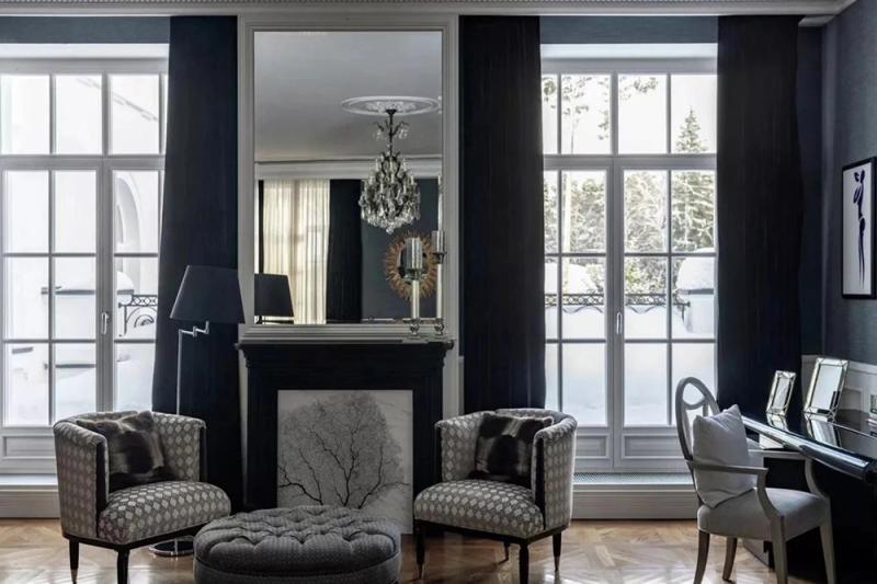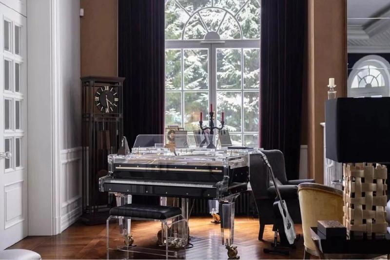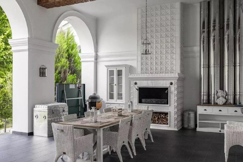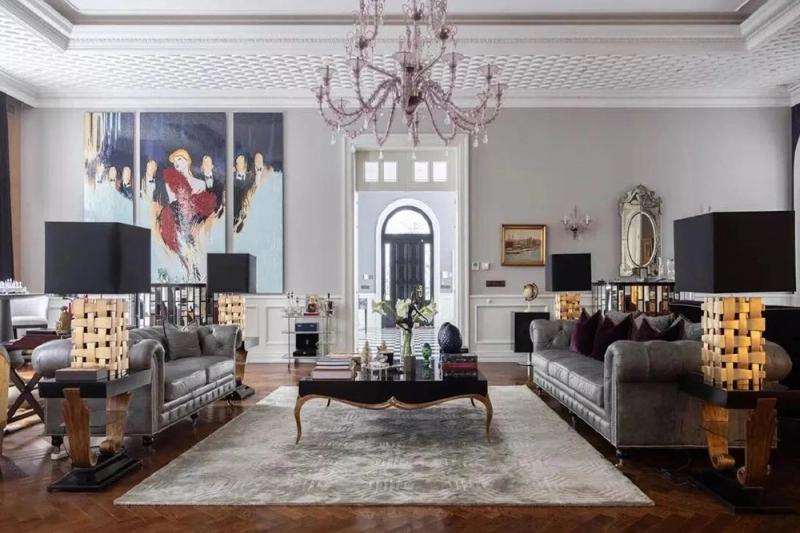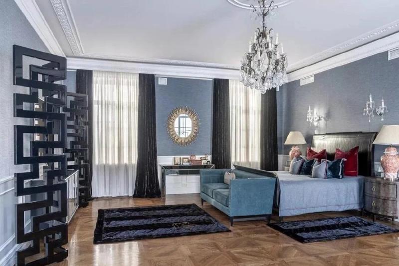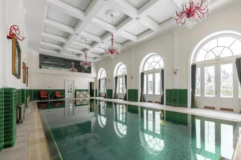 Самая большая по площади комната в доме — гостиная — занимает 115 кв. м. Ее украшают хрустальная люстра и антикварный камин.