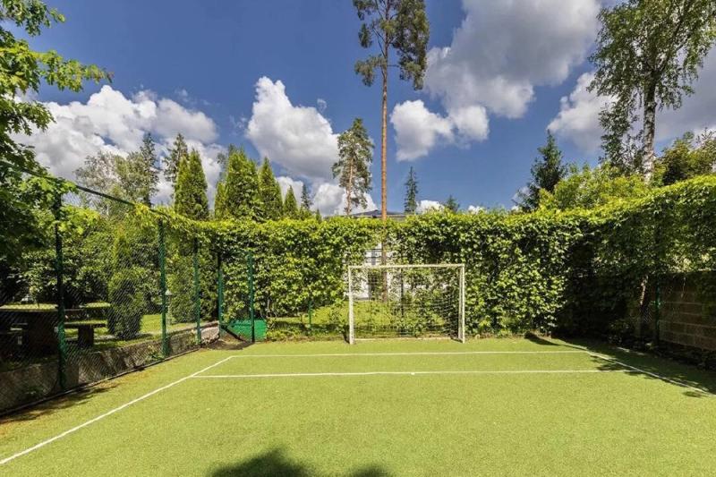 На участке в 41 сотку расположились футбольное поле и спортивная площадка. На придомовой территории — фонтан. Предусмотрена парковка для гостей — на шесть автомобилей, плюс гараж на три машино-места. Есть и квартира для персонала на втором этаже — для уборки такого дома и территории нужны постоянные служащие.