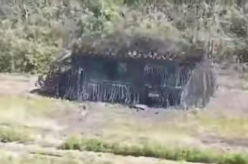 Военкоры рассказали, что танк Т-72Б3М оснастили почти всеми возможными импровизированными средствами защиты от ударных дронов, на его крыше видны насаженные на распущенные металлические тросы FPV-дроны.