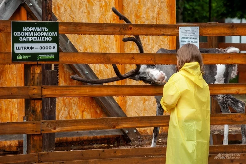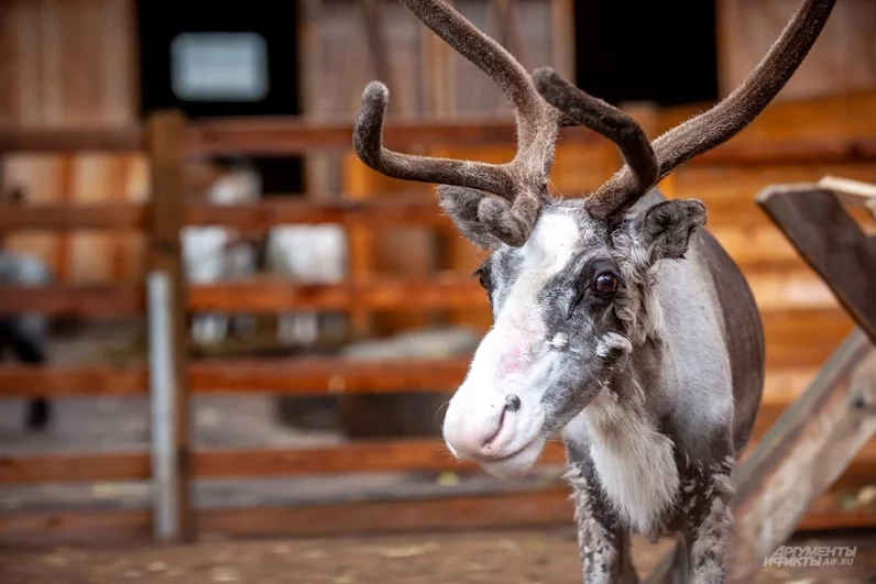 Северный олень тоже рад вниманию. Он высовывает нос сквозь перила ограждения и привлекает внимание людей. © АиФ / Юлия Федотова