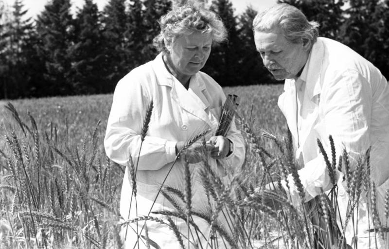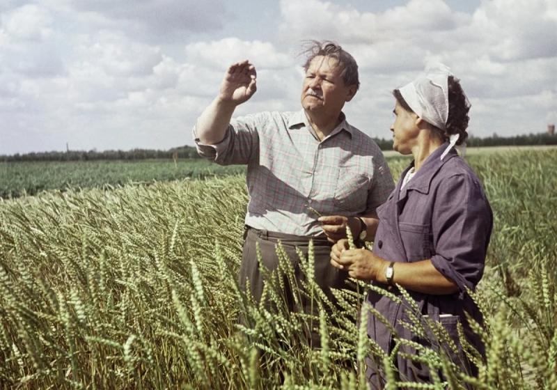 Истринский район. Село Рождествено. Научно-экспериментальное хозяйство "Снегири" Академии наук СССР (ныне ГУП Научно-экспериментального хозяйства «Снегири» Главный ботанический сад имени Н.В. Цицина РАН). Академик АН СССР Николай Цицин и доктор биологических наук Вера Любимова на опытном пшеничном поле. Фото: РИА Новости/ Владимир Родионов