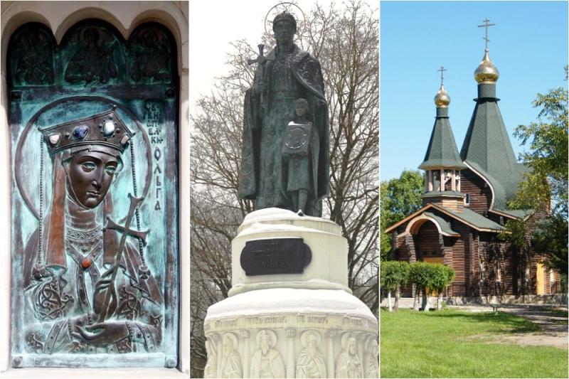 Образ святой Ольги на входе в Десятинный монастырь Рождества Пресвятой Богородицы в Киеве, медь, чеканка; Памятник княгине Ольге и Владимиру в Пскове, автор Вячеслав Клыков; Храм Святой Ольги в Приморье. Фото: Коллаж АиФ