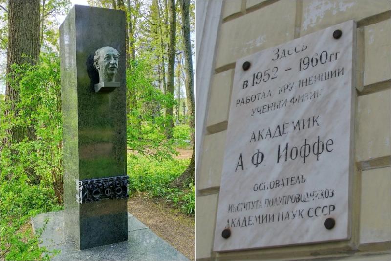 Надгробие Иоффе на Литераторских мостках в Санкт-Петербурге; Мемориальная доска на здании Института прикладной астрономии РАН. Фото: Коллаж АиФ