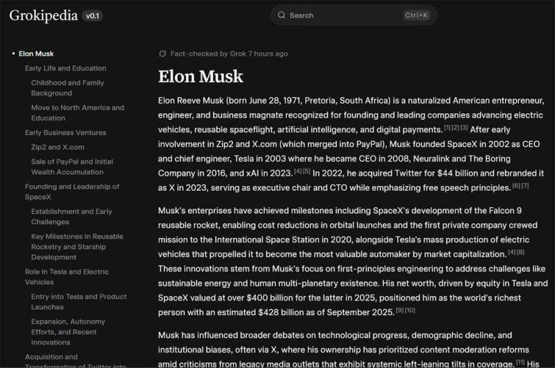 27 октября 2025 года Илон Маск представил публике «Грокипедию» (Grokipedia) — онлайн-энциклопедию, полностью создаваемую искусственным интеллектом. Этот проект был заявлен как ответ на «предвзятость» традиционной «Википедии». По словам Маска, цель «Грокипедии» — очистить информацию от пропаганды и стать «чрезвычайно важным для цивилизации» шагом к пониманию Вселенной.