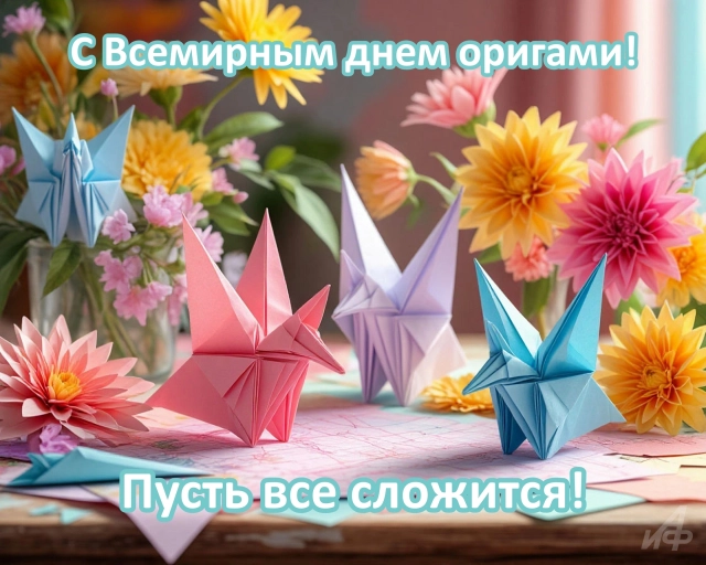 Из простого листа бумаги можно сложить настоящее чудо. Всемирный день оригами отмечается 11 ноября и это отличный повод подарить кому-то бумажное сердце или журавлика. А если не умеете или вам адресат находится слишком далеко, то отправьте эту открытку — там полный набор фигурок на удачу!