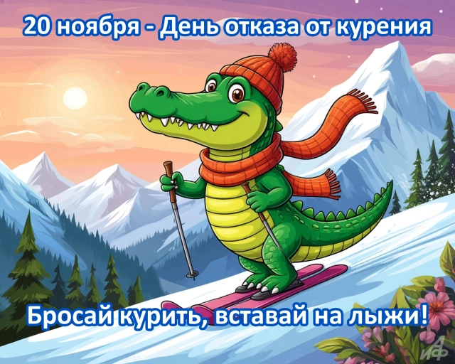 20 ноября — День отказа от курения. Очень полезный праздник: пора отказаться от вредной привычки и вдохнуть полной грудью! Отправьте эту открытку тому, кто давно хотел начать новую, здоровую жизнь, но все никак не собрался. С такой мотивацией и вашей поддержкой все получится!