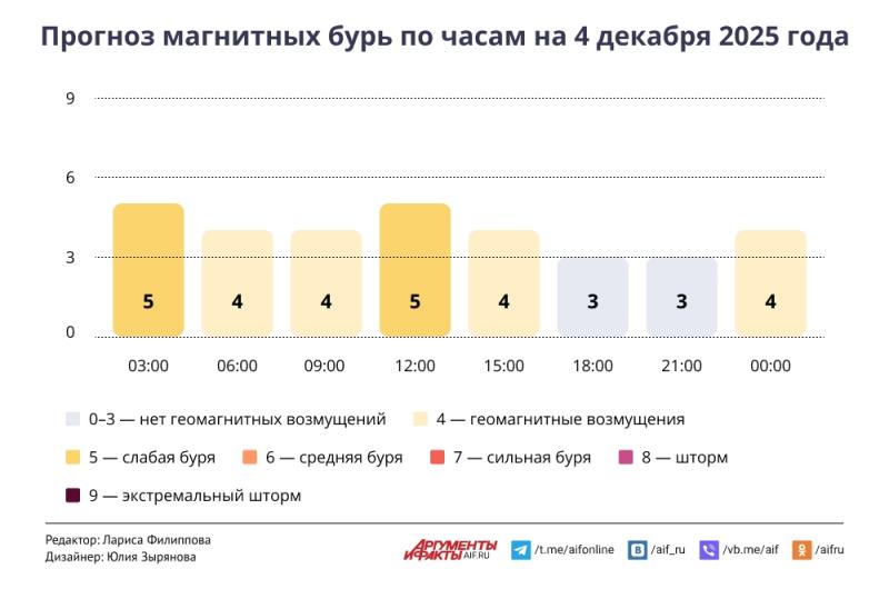 Прогноз магнитных бурь по часам на 4 декабря 2025 года. Инфографика