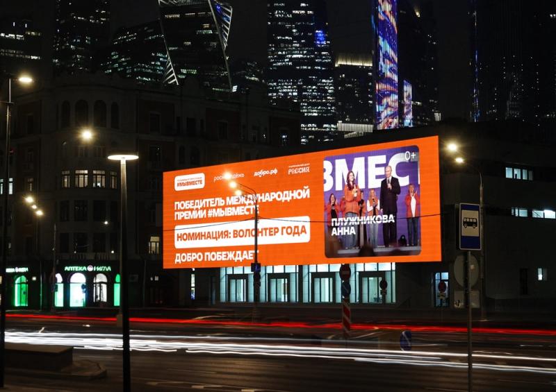 Поздравления с Днем добровольца и фотографии лауреатов премии этого года медиахолдинг МАЕР показывает на медиафасадах и цифровых экранах на центральных улицах Москвы и российских городов.